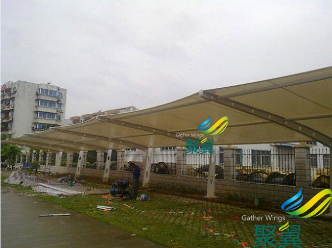 車棚材料選用了進口結構建筑材料。車棚骨架,表面處理采用進口船用底漆。膜結構是由多種高強薄膜材料(PVC或Teflon)及加強構件(鋼架、鋼柱或