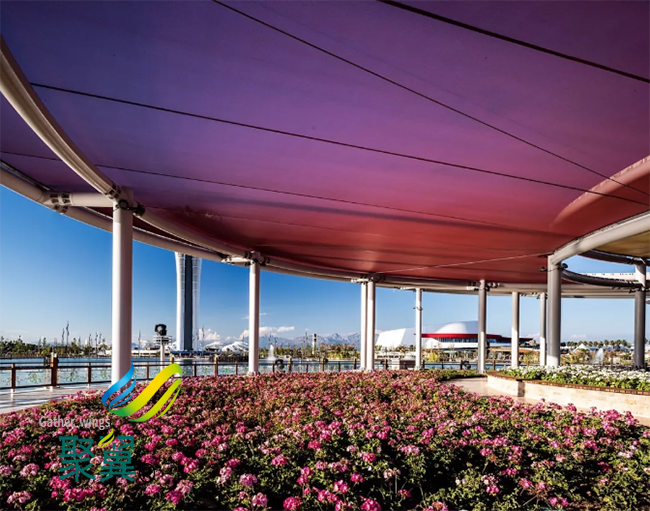 構思:此處為芍藥花海觀賞臺,種植了五顏六色的芍藥花。花海頂部使用了Soltis frontview 381網孔膜做張拉膜屋面。381網孔膜開孔度為28%,在遮陽護花同時,有效為花海提供必要的光線和空氣循環。381織物為珠光色,在陽光下,芍藥花的色彩直接映射于膜面,形成了天然的幻彩。
