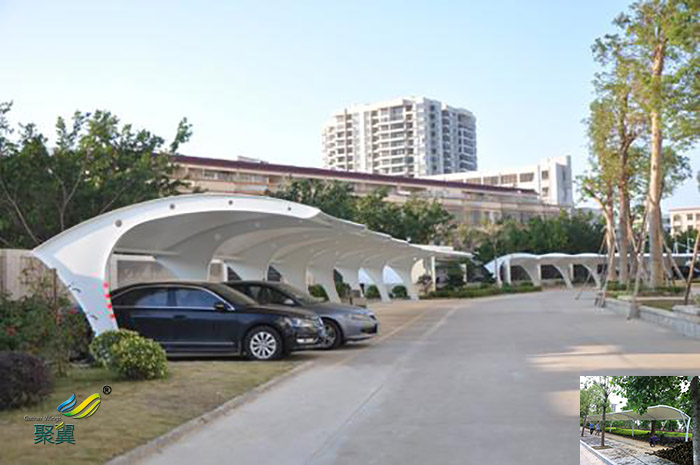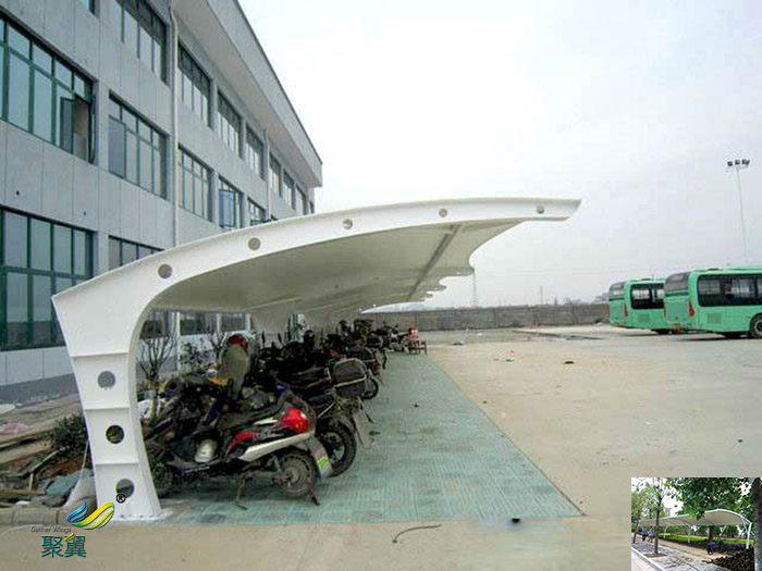 2、藝術性:除了一般工廠停車棚不可比較的有用、經用、遮風擋雨的功用外,工廠停車棚更是一座雕塑,一件藝術品,給人美的視覺享受。其柔美,其曲線,其剛柔并濟,其豐盛造型,其潔白無瑕,讓人眼前一亮,回味悠長。