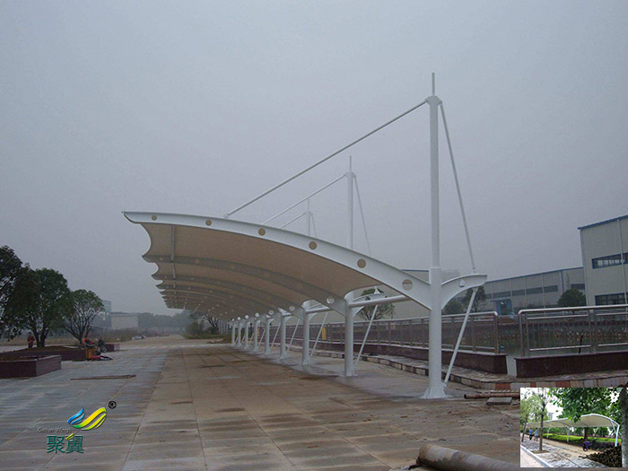 2、膜結(jié)構(gòu)車棚藝術(shù)性:除了一般車棚不可比擬的實(shí)用、耐用、遮風(fēng)擋雨的功能外,車棚膜結(jié)構(gòu)更是一座雕塑,一件藝術(shù)品,給人美的視覺享受。柔美,曲線,剛?cè)岵?jì),豐富造型,潔白無瑕,讓人眼前一亮,回味悠長。