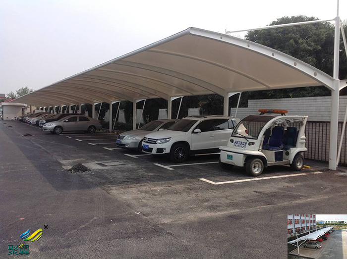 膜結(jié)構(gòu)車棚的篷布材質(zhì)是膜結(jié)構(gòu),而膜材的最大特點是強度高、耐久性好、防火難燃、自潔性好,不受紫外線影響,使用壽命長,一般15-30年.具有高透光率,透光率為13%,對熱能反射率73%,熱吸收量很少.正是因為這種劃時代的膜材料的發(fā)明,使膜結(jié)構(gòu)車棚成為現(xiàn)代化的永久建筑.鑒與此,膜結(jié)構(gòu)造型的停車棚在停車場建設(shè)中也以其優(yōu)美的造型和實在的功能擔(dān)當(dāng)重要角色,是您的愛車最佳安身之所.