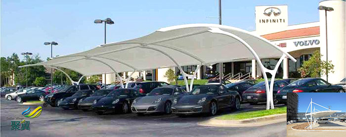 膜結(jié)構(gòu)車棚耐候性:表面有防紫外線的共擠層,可防止太陽紫外線引起的樹脂疲勞變黃。表面共擠層具有化學吸收紫外線并轉(zhuǎn)化為可見光。對植物光合作用有良好的穩(wěn)定效果(極適合保護各類車、貴重藝術(shù)品及展品,使其不受紫外線破壞)。