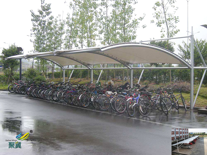 2、膜結構自行車車棚防火性和耐久性,理想的建筑用膜材料,膜結構自行車車棚具有耐熱性、耐氣候性、耐藥物性、高強度、防火等特性,而且不易老化,經過長期使用仍能保持其最初時的強度.如今廣泛使用的膜材料能很好地滿足對于防火的需求,具有卓越的阻燃和耐高溫性能,達到法國、德國、美國、日本等多國標準.