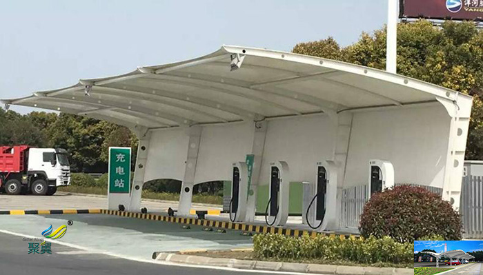 1.膜結構汽車棚具有藝術性,除了一般的雨篷具有不可比擬的使用價值,且比較耐用,具有遮風擋雨的效果,不僅如此,還給人以審美享受。它本身具有柔軟的曲線效果,并且可以柔軟靈活,形狀豐富,使用起來非常方便。充電樁雨棚