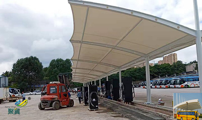 大巴停車棚采用國產或純進口PVDF高強度建筑膜材,使用壽命均可達15-30年。