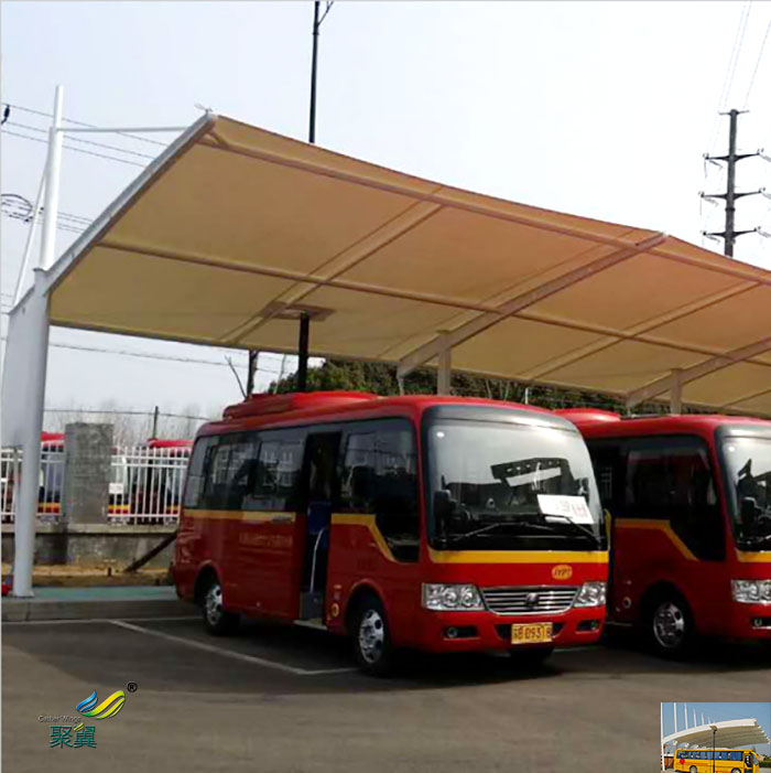 大巴停車棚耐熱性、耐久性、自潔防污性、防火性能強(防火B1級)。