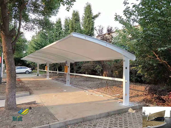 膜結構停車棚耐候性:表面有防紫外線的共擠層,可防止太陽紫外線引起的樹脂疲勞變黃。表面共擠層具有化學芻吸收紫外線并轉化為可見光。對植物光合作用有良好的穩定效果(極適合保護各類車、貴重藝術及展品,使其不受紫外線破壞)。