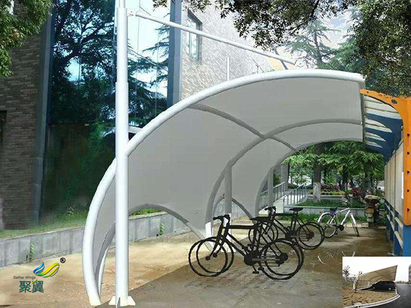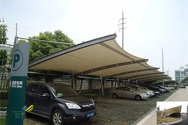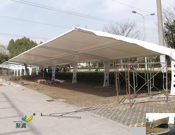 膜結汽車停車棚藝術性:除了一般雨蓬不可比擬的實用、耐用、遮風擋雨的功能外,更是一座雕塑,一件藝術品,給人美的視覺享受。其柔美,其曲線,其剛柔并濟,其豐富造型,其潔白無瑕,讓人眼前一亮,回味悠長。