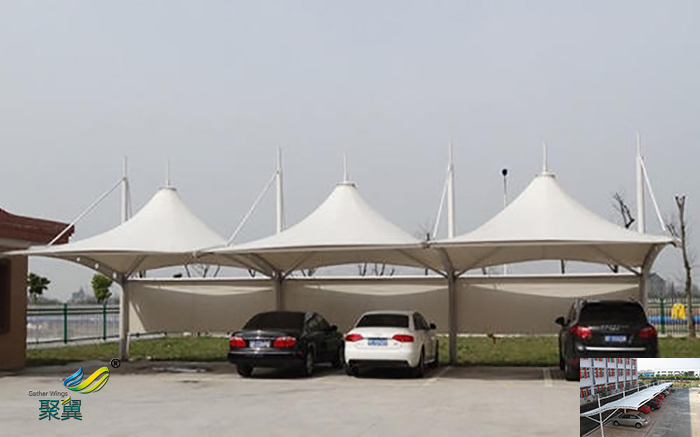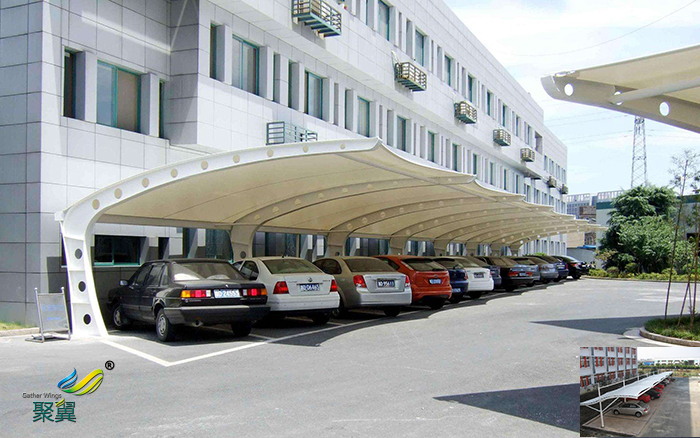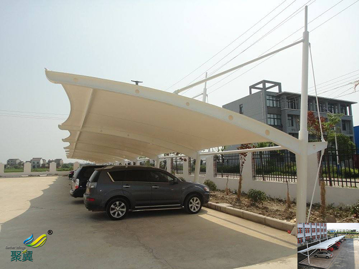 2、自潔性,張拉汽車膜結構學校停車棚膜材料表面加涂的防護涂層(聚氟乙烯、丙烯酸等)具有耐高溫的特點。而且奉身不發粘。這樣落到膜材表面的灰塵可以靠雨水的自然沖洗而達到自潔的效果。