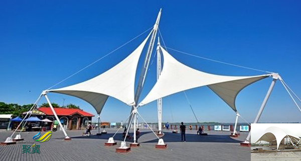 景觀膜結構的篷布材質是膜結構,而膜材的最大特點是強度高、耐久性好、防火難燃、自潔性好,不受紫外線影響,使用壽命長,一般15-30年。具有高透光率,透光率為13%,對熱能反射率73%,熱吸收量很少。正是因為這種劃時代的膜材料的發明,使膜結構車棚成為現代化的永久建筑。