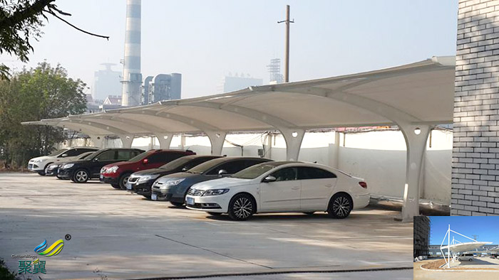 7.膜結構汽車停車車棚防火性和耐久性-理想的建筑用膜材料 聚翼膜結構車棚,專業從事車棚的國內研發和生產的實體企業,有自主研發生產基地和5A級商務辦公場所。