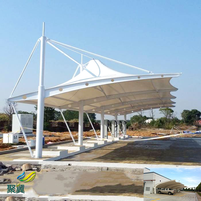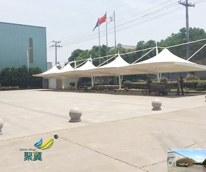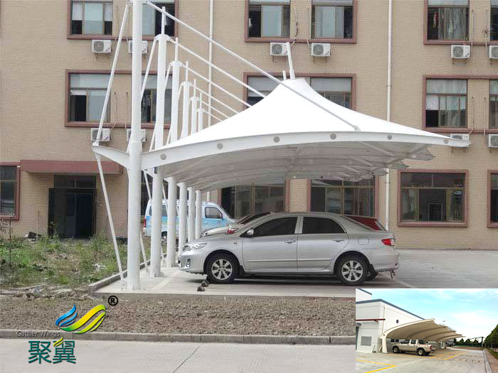 1、帽口膜結構車棚有利排雨排雪功能,頂部拉索結構增加建筑藝術感,造型時尚美觀。