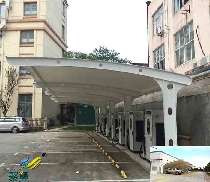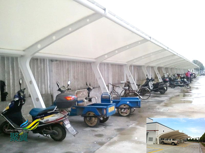 學校車棚結實更耐用,因為使用了比較高強度的膜材,再加上目前張拉技術的使用,讓這種車棚的防雨能力更強,目前很多車棚使用了永久模式的膜材,使用了三四十年都沒有問題,尤其是遇到了劇烈的暴風雨氣候,也不會損壞。
