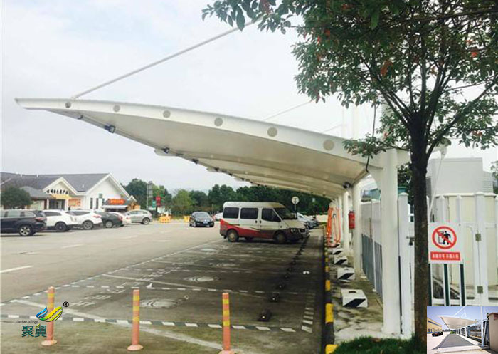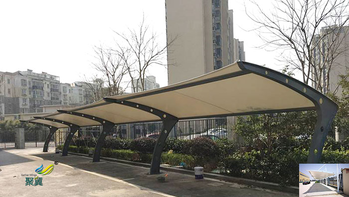 3.膜結構定制停車車棚耐候性—表面有防紫外線的共擠層,可防止太陽紫外線引起的樹脂疲勞變黃。