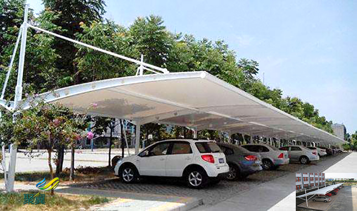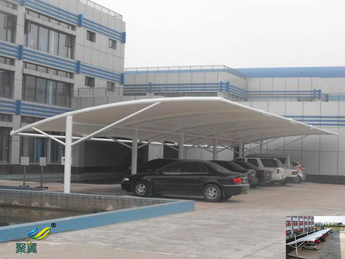 膜結構車棚是由多種高強薄膜材料及加強構件(鋼架、鋼柱或鋼索)通過一定方式使其內部產生一定的預張應力以形成某種空間形狀,作為覆蓋結構,并能承受一定的外荷載作用的一種空間結構形式。