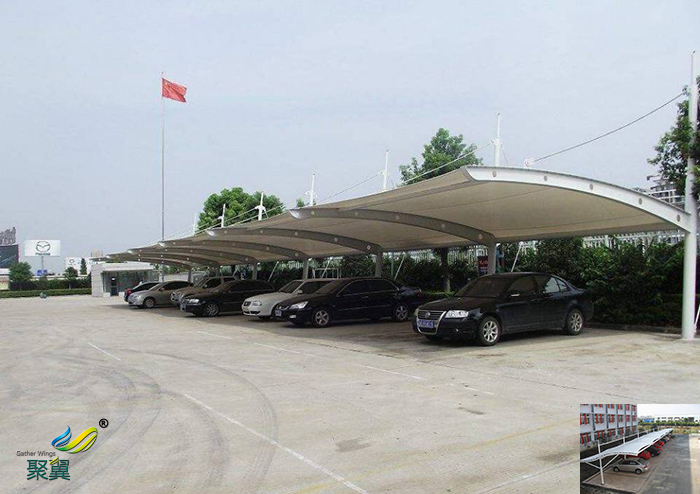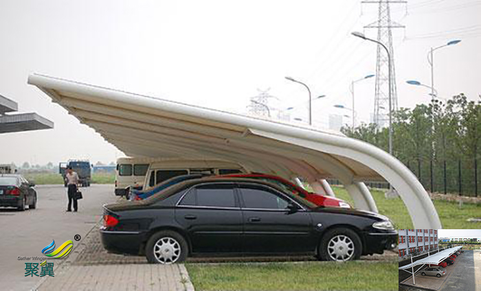 第四、自由獨特的造型,膜結構車棚造型多變,能夠適應不同風格建筑,更加新穎美觀,而且膜材料的色彩豐富、鮮艷,視覺效果非常好。相對于傳統車棚,它的美觀特性更是得到了充分的展現。