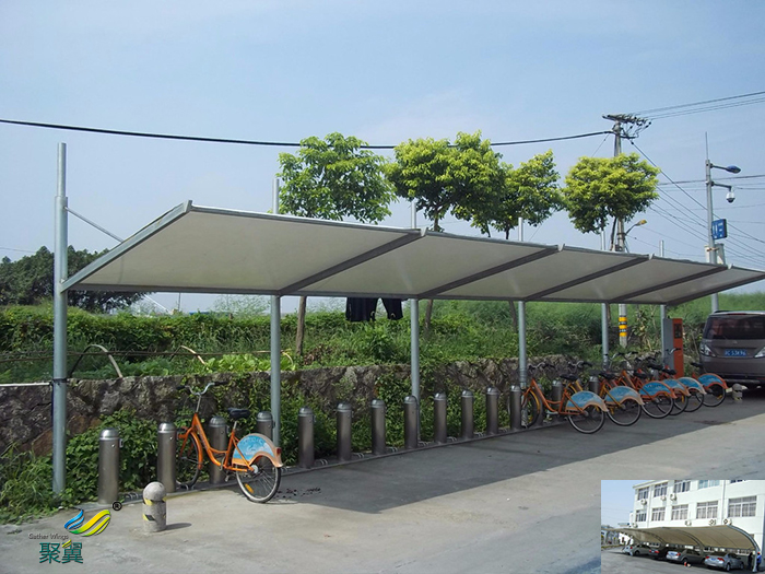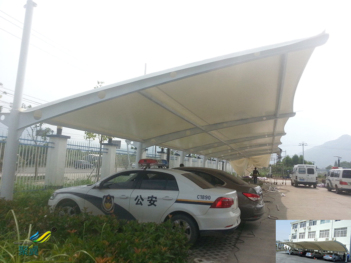 2、汽車停車棚更好的經濟效益,膜建筑屋面重量僅為常規鋼屋面的1/30,這就降低了墻體和基礎的造價。同時膜建筑奇特的造型和夜景效果有明顯的“建筑可識性”和商業效應,其價格效益比更高。