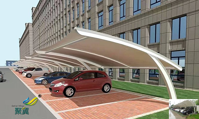 膜結構車棚藝術性,除了一般雨蓬不可比擬的實用、耐用、遮風擋雨的功能外,膜結構雨蓬更是一座雕塑,一件藝術品,給人美的視覺享受。其柔美,其曲線,其剛柔并濟,其豐富造型,其潔白無瑕,讓人眼前一亮,回味悠長。