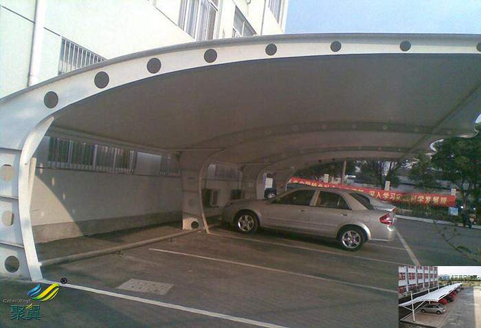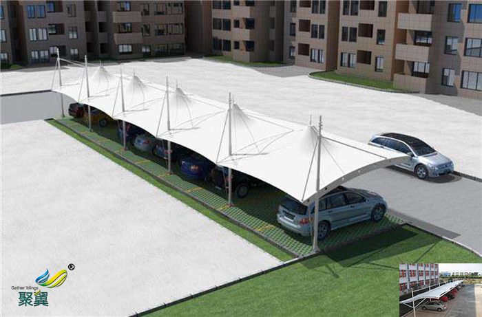 非機(jī)動汽停車棚具有耐熱性、耐氣候性、耐藥物性、高強(qiáng)度、防火等特性,而且不易老化,經(jīng)過長期使用仍能保持其強(qiáng)度。如今廣泛使用的膜材料能很好地滿足對于防火的需求,具有卓越的阻燃和耐高溫性能,達(dá)到法國、德國、美國、日本等多國標(biāo)準(zhǔn)。
