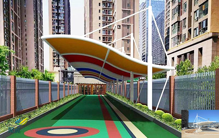 膜結構車棚的透光率是20%,透光性能好,在陽光下曝曬不會產生黃變、霧化、透光不佳。