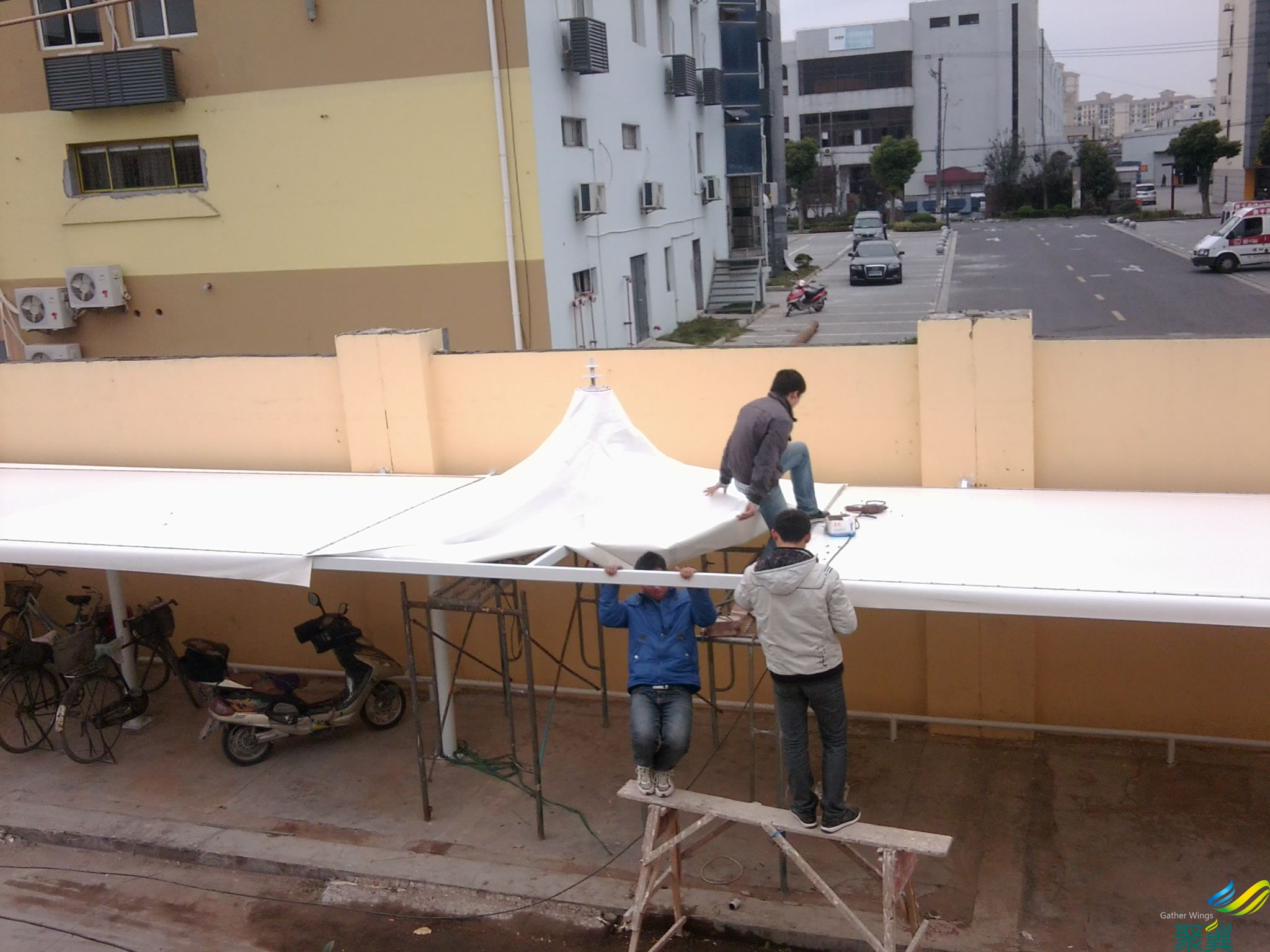 詳細>>膜結構車棚制作操作流程:車位測量、設計、確認方案、基礎預埋、鋼結構部分焊接、鋼構工藝、膜布...