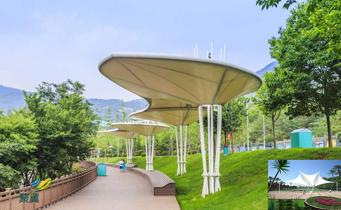 詳細>>深圳膜結構張拉膜膜傘、景觀小品停車棚雨棚工程設計