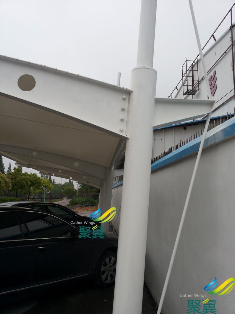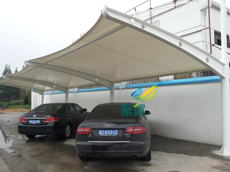 JY60拆卸式膜結構車棚6車位案例,充分利用了有限的停車空間,簡潔、大方實用的最佳占地面積。主體采用加強型鋼結構,鋼結構專用底面油漆。車棚面料采德國進口B1018材質保15年,自潔性能好,其表面無靜電,對灰塵沒有吸附力,易清洗。從而使得膜結構建筑保持表面亮麗潔白,室外使用壽命約為20年。