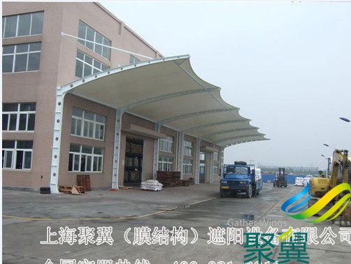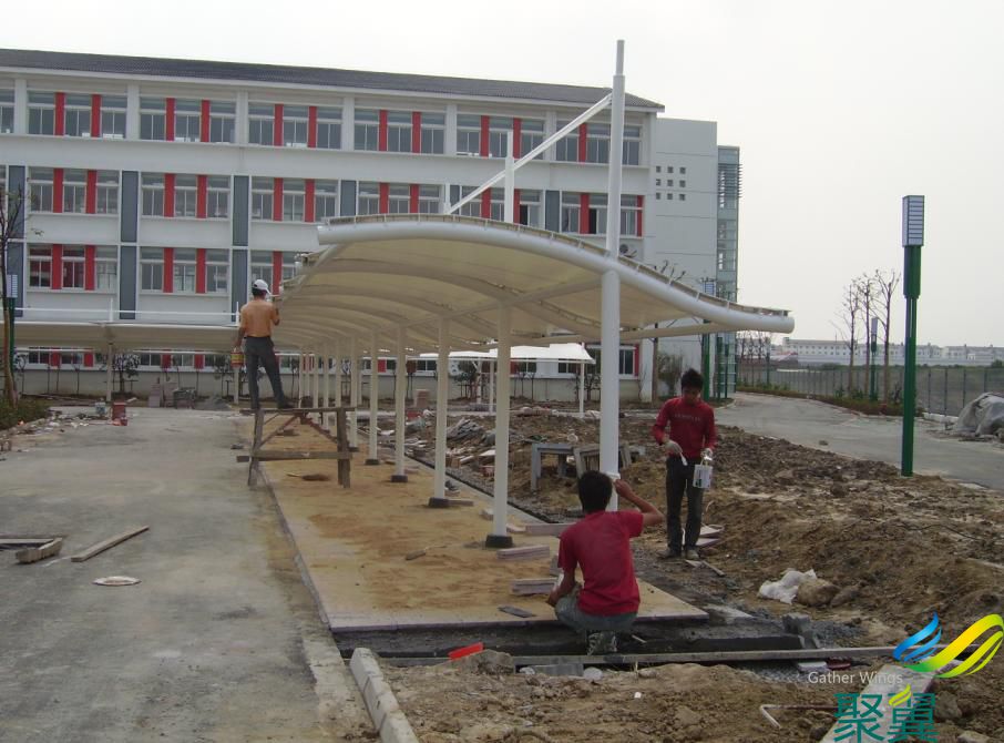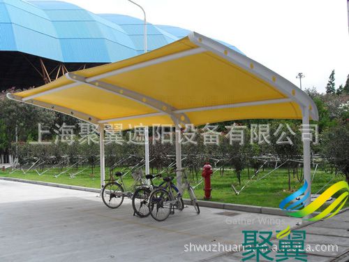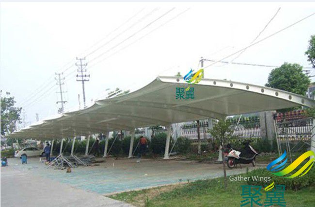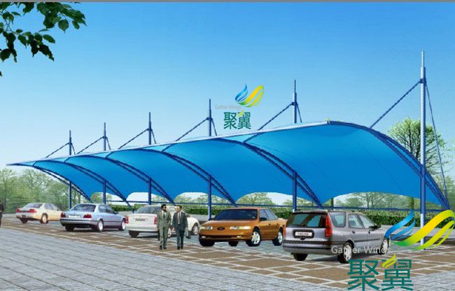 停車棚材料選用了進口結構建筑材料。車棚骨架,表面處理采用進口船用底漆,炳烯酸聚氨酯面漆。車棚的篷布材質是膜結構,而膜材的最大特點是強度高、耐久性好、防火難燃、自潔性好,不受紫外線影響,使用壽命長,一般15-30年。