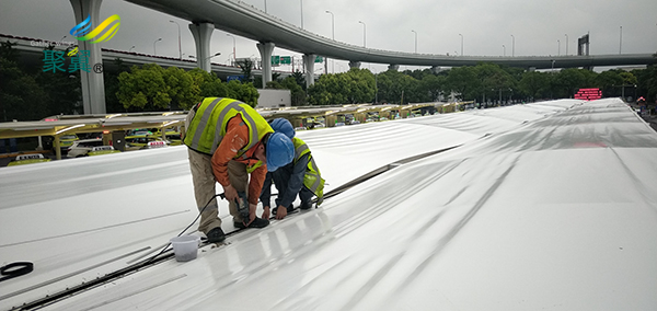 膜結構車棚主體采用加強型鍍鋅鋼結構,環氧富鋅底面油漆。車棚面料采聚翼PVDF膜布材質保10年,自潔性能好,進口技術中國自主生產PVDF膜布材料其表面無靜電,對灰塵沒有吸附力,長期用于室外浮灰可利用自然力量(風、雨)除去。從而使得膜結構建筑保持表面亮麗潔白,室外使用壽命約為12年。