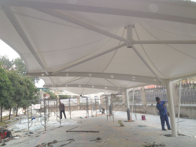 新沂瓦窯中學冒頂車棚尺寸為28.5*6,間距5.7米,面料采用賽德樂s1000-II膜材,膜材的壽命及使用保障國產膜材為15-30年。冒頂車棚根據施工現場作業和技術要求本廠采用德國塞德樂s1100-II(白色),和Q235熱鍍鋅高強度優質鋼材及其他精品配件精加工制作成品。安裝細節:主體為鋼構焊接,采用主框架與部分結構同步安裝施工,油漆現場作業完成。膜布廠內加工成品現場安裝細節處理。需膜結構車棚可以咨詢我司,詳情電話:4008-613-119(客服熱線)