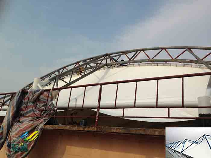 污水池蓋也叫污水池罩、臭氣收集罩。是一種新型的大跨度空間結構,越來越受到用戶的喜愛和使用,污水池加蓋        是由具有優良性能的織物(膜材)通過支撐構件(如剛性梁、柱、柔性索),或給膜內空氣加壓以一定的方式組合并施加      適當的初始預張力而形成具有一定剛度的空間結構形狀,從而承受一定外荷載的一種空間結構形式。而膜材料是大        跨度空間結構最重要的組成部分,被稱為“第五代建材”。具有耐腐阻燃,堅固防滑、質量輕、易安裝、免維護、絕        緣等優異特性。