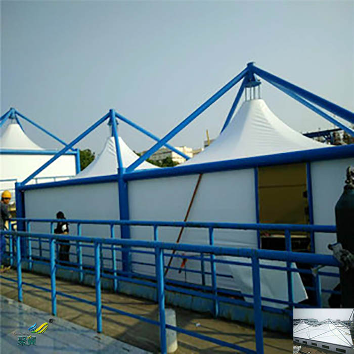 1. 膜材方面;對污水池進行膜加蓋,要求膜材料本身必須具有很強的抗腐蝕性和氣密性,否則,廢氣收集工作將毫無效果。污水池廢氣收集工作者都知道,膜材料是由基布和涂層兩部分組成。通常,基布考慮采用聚酯纖維材料,對污水池廢氣具有高抗腐蝕能力,能很好地吸附廢臭氣體,達到凈化的目的;而涂層選擇聚氯乙烯,具有抗拉強度高,耐磨,無毒衛(wèi)生等特點,增強了膜材的抗氧化性,防止PVC老化,延長了膜材的使用壽命。