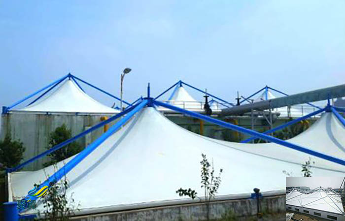 3.膜結構污水池加蓋造價低。一般來說污水池的跨度一般較大,需要鋼材多。使用反吊膜建筑可有效減少鋼材使用率,從而降低成本。