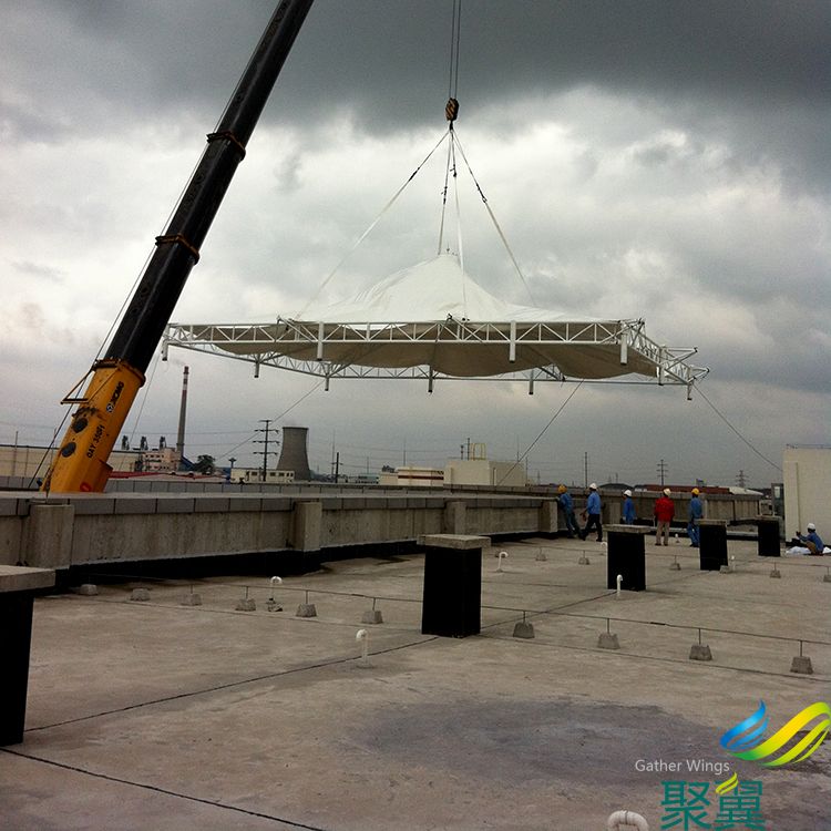 屋頂膜面拼接完工后按安裝要求對進行折疊、裝箱,運到現場后直到吊裝到安裝位置才能展開。安排好與主體鋼結構安裝,協調相互間的進度。屋頂膜面安裝施工時應注意天氣預報,保證在整個安裝過程中無四級以上大風和大雨。