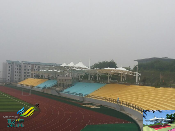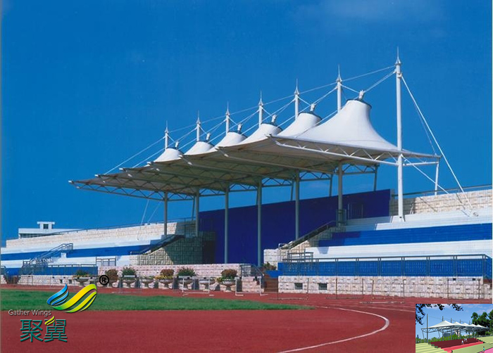 2、膜結構體育看臺具有質輕、強度高、跨度大、耐腐、耐高溫、防震、無二次污染、自潔性等優點這對學校衛生的要求。