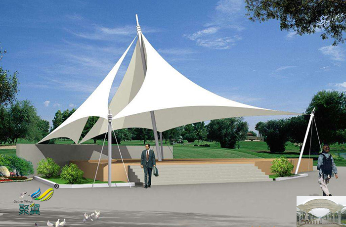 一點,膜結構車棚造型美麗,有杰出的視覺作用。這一點是無可厚非的,我們在日常生活中能夠看到那些造型構思特別的浙江景觀膜結構。膜材能夠讓設計師充分發揮幻想,隨意刻畫造型。并且膜結構采光頂的結構與造型、技能與藝術得到了結合和高度的一致,因而又被稱為藝術采光頂或藝術外維護結構。