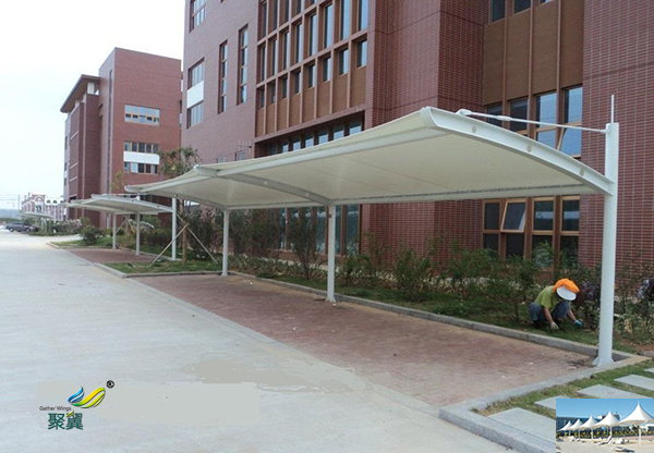 2、膜結構停車棚膜布特性:就算同原料的 膜結構由于化學成分的不認同,厚度,可清洗性,伸展性各有不同,假如經濟答應可以一味求高,但一般情況下依據自己實踐需求挑選。