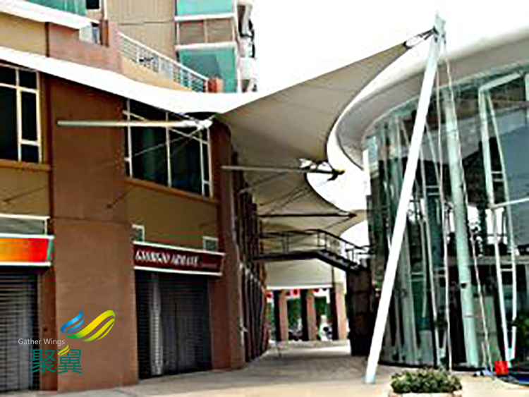 上海張拉膜過道棚特別的性質是強度比較 高、經久性比較好、阻燃性比較強、自潔性也比較好,不受紫外線的影響,可以使用很久,重要的是張拉膜保護人不被紫外線曬。