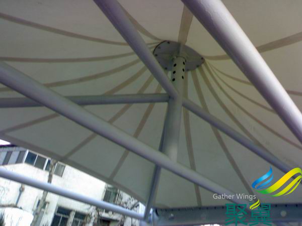 此款膜結構景觀廳面料可采用PVDF膜材、PTFE膜材、PVC膜材及ETFE等膜材料,產品的壽命及使用保障國產膜材為8年-15年,進口膜才為15年-30年。膜結構景觀根據施工現場作業和技術要求本廠采用米樂膜材R700膜材(白色),和Q235熱鍍鋅高強度優質鋼材及其他精品配件精加工制作成品。 安裝細節:主體為鋼構焊接,采用主框架與部分結構同步安裝施工,油漆現場作業完成。膜布廠內加工成品現場安裝細節處理,本廠施工負責人專職人員檢測后交于施工項目經理驗收! 風景廳展示圖(一):