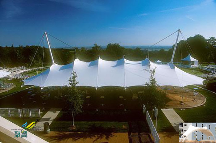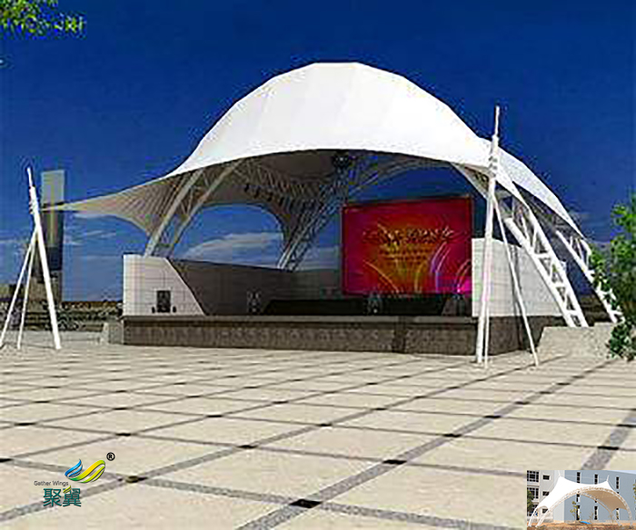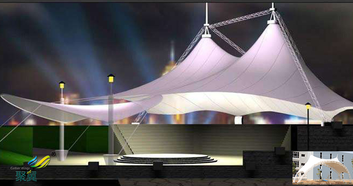 1、舞臺張拉膜結(jié)構(gòu)的共同曲面外形使其具有激烈的雕塑感,膜面經(jīng)過張力到達(dá)自平衡。
