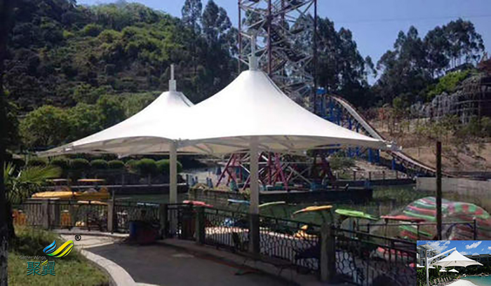 作為現代空間結構體系的一個重要分支,膜結構是一種全新的建筑結構形式,除豐富多彩的造型外,還有優異的建筑特性、結構特性和適宜的經濟性。造型設計時尚美觀的特點,其還具有良好的遮陽擋雨的功效。首先可以阻隔陽光直射,防止傘內過熱,其次在隔熱同時仍然保持良好的通風效果。