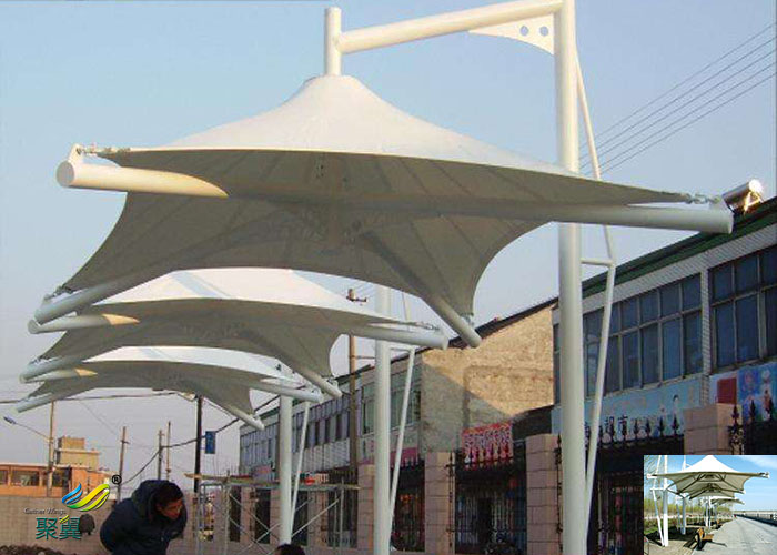膜結構廣場膜傘首先可以阻隔陽光直射,防止傘內過熱,其次在隔熱同時仍然保持良好的通風效果。膜結構遮陽傘常用的膜材有pvc及PTFE兩大類,這兩種材料均具有防火難燃、強度高、耐久性好,不受紫外線影響,使用壽命長等優良性能。目前被廣泛應用于社區、停車場、體育場、公園、廣場等。