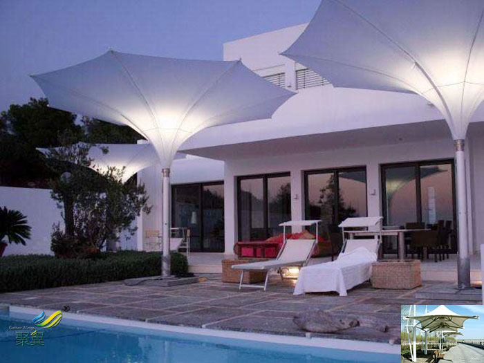 膜結構廣場膜傘是一種建筑與結構完美結合的結構體系。它是用高強度柔性薄膜材料與支撐體系相結合形成具有一定剛度的穩定曲面,能承受一定外荷載的空間結構形式。其造型自由輕巧、阻燃、制作簡易、安裝快捷、節能、易于、使用安全等優點,因而使它在世界各地受到廣泛應用。這種結構形式特別適用于大型體育場館、人口廊道、膜結構車棚,膜結構景觀,張拉膜 膜傘 膜結構小品、膜結構自行車棚 公眾休閑娛樂廣場、展覽會場、購物中心等領域。