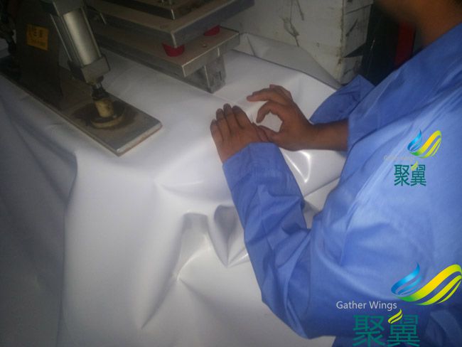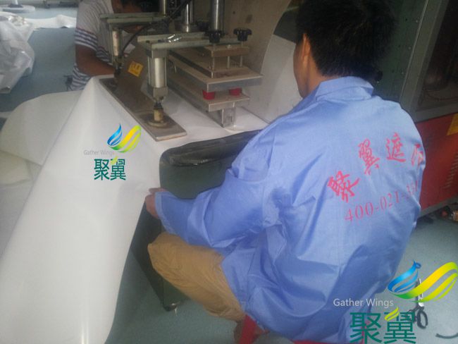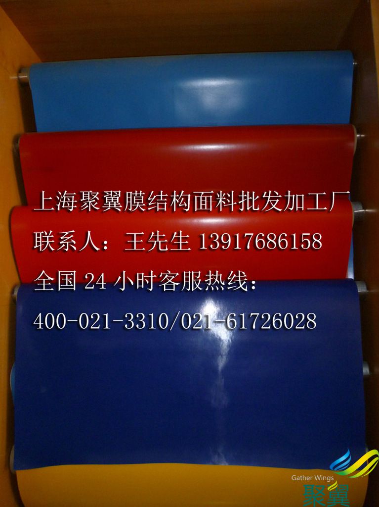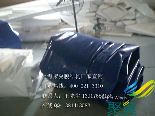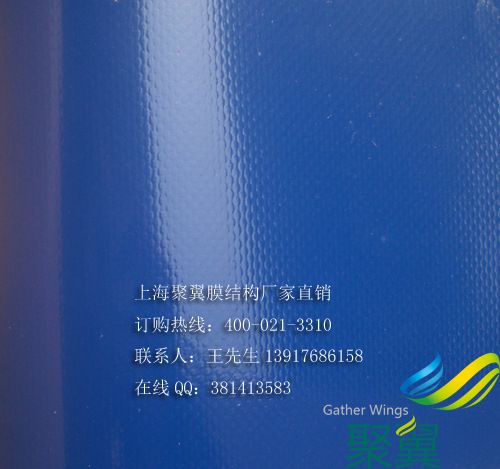 聚翼PVC藍色膜布:門幅2060mm,每卷50米。2000米以上可定做任何色系! 膜布的門幅有2.5\3.0\3.5等根據不同膜布造型選擇最節省膜布的設計裁剪圖,減小損耗降低成本,方便安裝縮減膜結構的制作工期!之后轉交膜布裁剪部依裁剪圖精確剪裁所需膜布形狀大小后,送交焊接部焊接制作,經過高頻熱合機焊接成型后送檢測部,經檢測合格后送交包裝部打包,制作完成后發貨,安裝!
