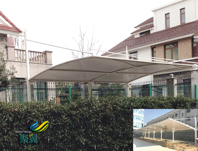 膜結構車棚金屬車棚頂棚一般都是采用聚碳酸酯材料或者是彩鋼板,二者的透光性和膜結構相比,膜結構車棚材料的透光性更好,而且膜結構車棚作為一種高分子布的話,不會因為長時間的直曬變黃,也不會物理特性發生變化。