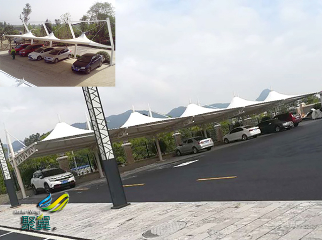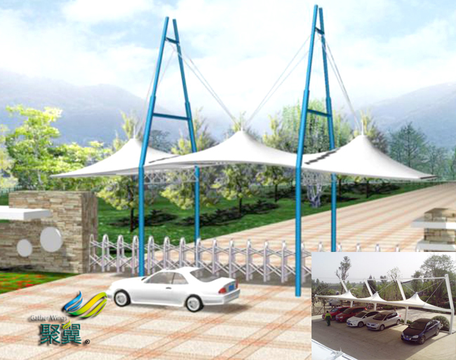 膜結構車棚是提供給車輛停泊的地方,使車輛避免了風吹雨打。來保護自行車,汽車等不受損傷。在膜結構車棚未出現之前,市場主要的是鐵制車棚,鋁合金車棚,彩鋼車棚等。這些膜結構車棚都是采用金屬構件來制作,因此具有笨重,形式單調的缺點,沒有個性和美觀。
