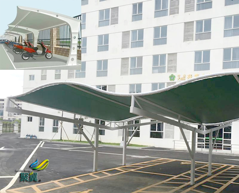 膜結構車棚直接焊接,無須打磨或加連接條,徹底清除第一代PVDF膜材所引起的各種工程質量隱患,如:因膜結構車棚焊縫處涂層需打磨而產生的焊接強度不穩定等等,大大減少膜結構車棚膜材加工的工作量,降低加工成本。