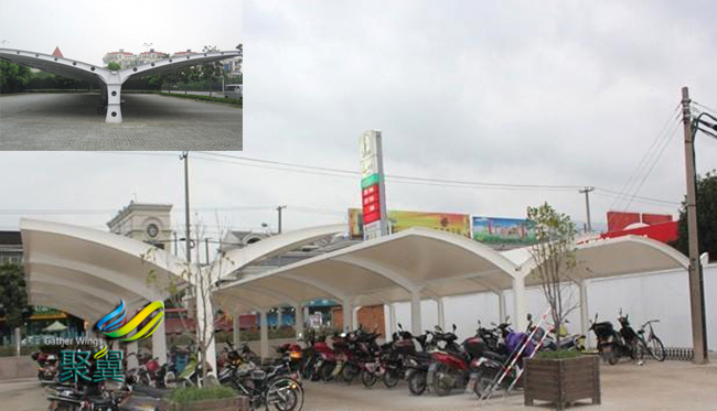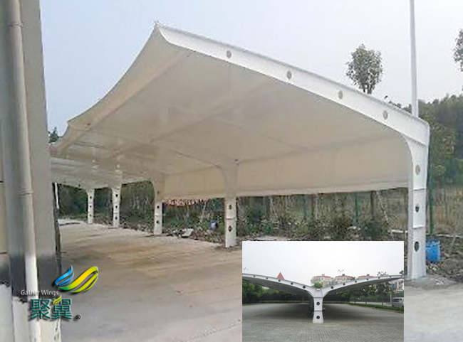 這些方法都能改善膜結構車棚PVc膜材料的自潔性,特別是在表面粘貼PVF薄膜(氟化乙烯)能大大改善膜結構車棚膜材料的自清性及抗老化性。
