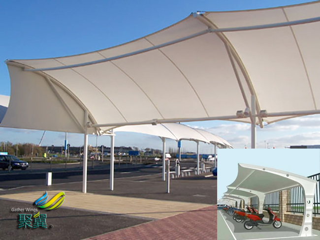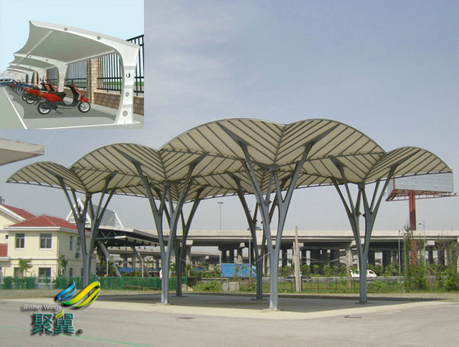 施加膜結(jié)構(gòu)車棚預(yù)張力時應(yīng)以施力點位移達(dá)到設(shè)計值為控制標(biāo)準(zhǔn),位移允許偏差為±10%。對有代表性的施力點還應(yīng)進(jìn)行力值抽檢,力值是允許的偏差是為±10%。是應(yīng)由設(shè)計的單位是及施工單位共同選定有代表性的施力點。