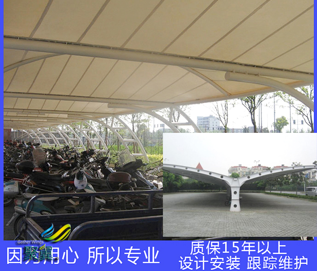 膜結構車棚力與柔的完美聯系,千變萬化的柔美外型.這種膜結構車棚膜資料是柔性的,由于是經緯交錯受力,也就能構成完美的正、負高斯曲率的雙曲流線形,如我們熟知的馬鞍形等,加之高強鋼索在邊界的預張力及骨架構造的支撐,可以充分體現力與柔的完美聯系并能呈現出千變萬化的外型形狀.